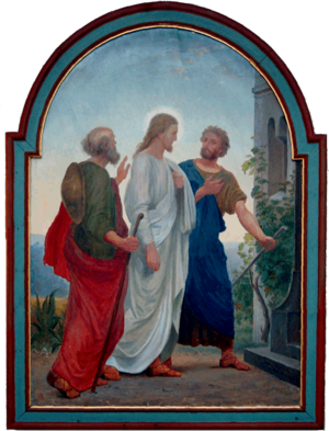 Den tredje dagen etter at Jesus ble korsfestet, - altså påskedag - møtte to av hans disipler ham på veien til Emmaus. Dette møtet er beskrevet i Lukas-evangeliet 24, 13-27.